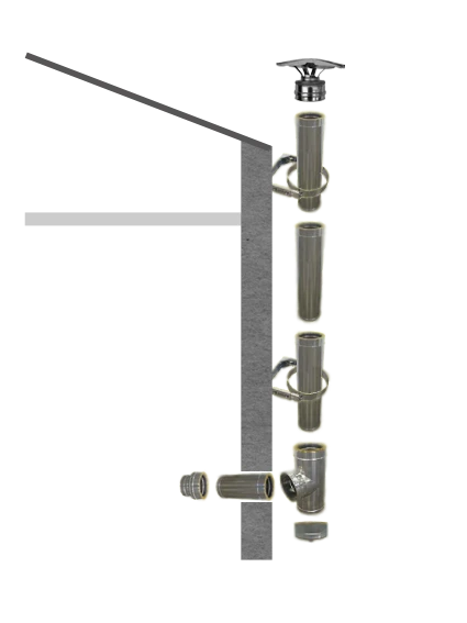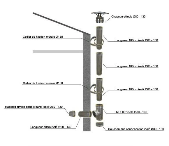 Ensemble de tuyaux et accessoires en conduit isolé double paroi inox de diamètre 80 mm intérieur et 130 mm extérieur vous permettant de créer un conduit d’évacuation des fumées extérieur.